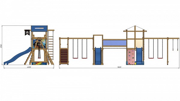 выполнен из древесины с особым покрытием, предохраняющим поверхность от внешних воздействий. В комплектации площадки есть две пары качелей, две высокие горки, веревочная лестница, кольца, сетка и стенка для лазания, песочница, длинный балкон и домик наверху.