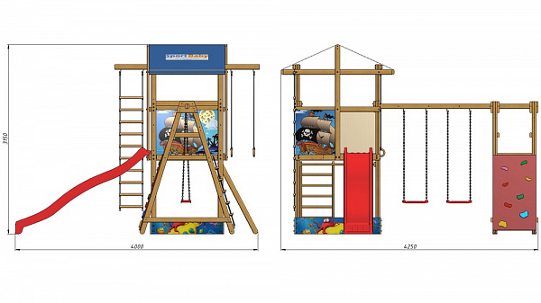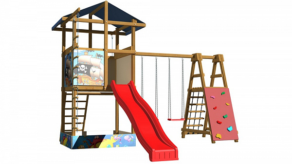 Комплектация Детская площадка SportBaby-9: 1. Башня с песочницей. 2. Детская горка длина – 3 метра (красная, синяя, зеленая, желтая). 3. Лестница. 4. Площадка со скалолазкой и гладиаторской сеткой. 5. Качели 2 шт. (красные, зеленые) или деревянные. 6. Кольца. 7. Веревочная лестница. Возможно изготовление по индивидуальным размерам в различной комплектации и цветовой гамме. Производитель оставляет за собой право вносить в конструкцию изменения, не ухудшающие эксплуатационные характеристики изделия.