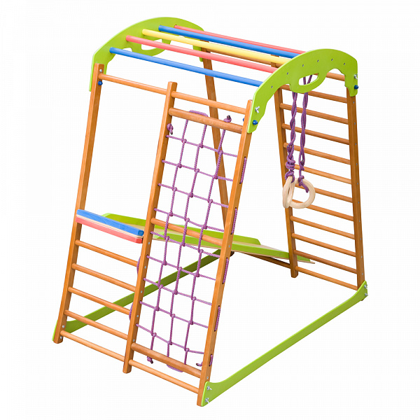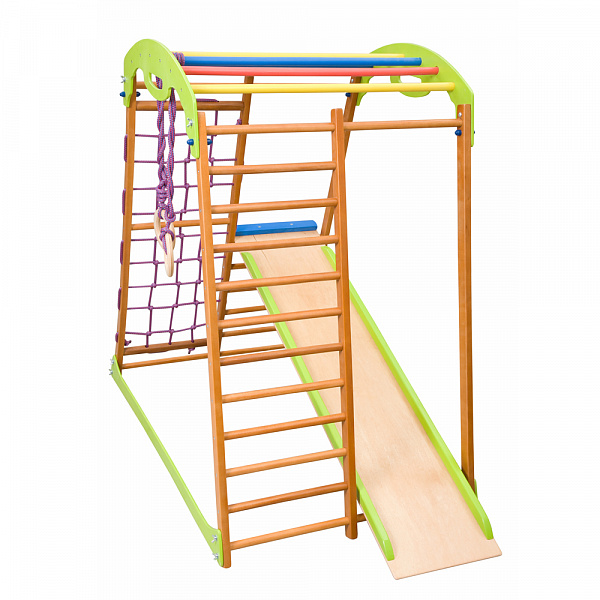 Комплектация Детский спортивный комплекс для дома BabyWood В комплектацию детского спортивного комплекса для дома BabyWood входят спортивные элементы, которые развивают координацию движений, моторику ручек и ножек ребёнка, благотворно влияют на его нервную и сердечно-сосудистую систему: В его комплектацию входят такие спортивные элементы: 1. Шведская стенка. 2. Гладиаторская сетка. 3. Рукоход 4. Детская горка. 5. Кольца.