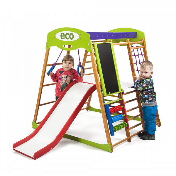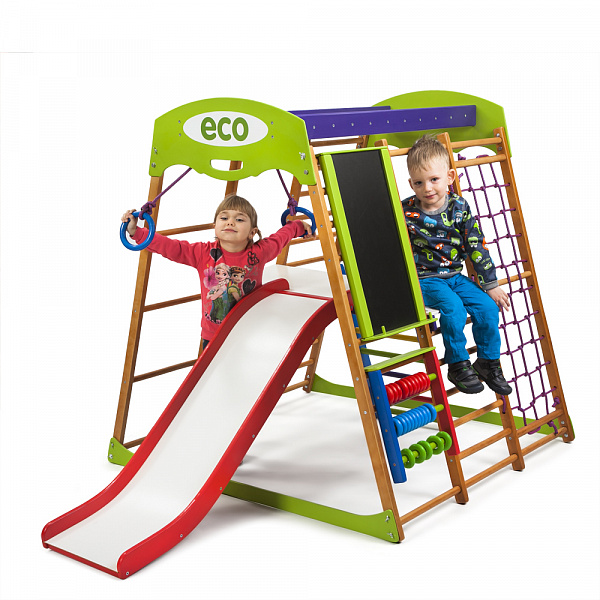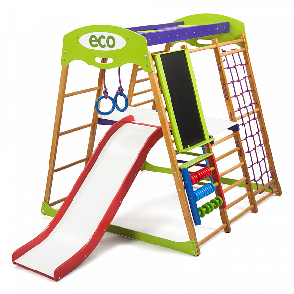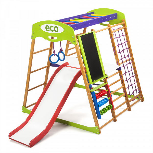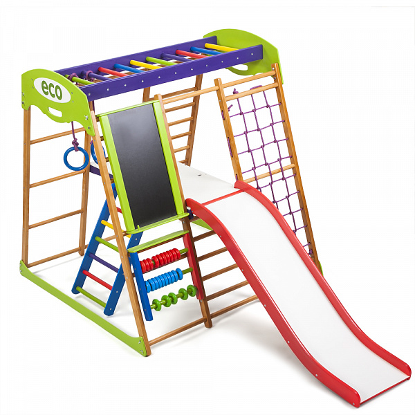 Комплектация Детский спортивный комплекс для квартиры Карамелька Plus 3 1. Шведская стенка. 2. Гладиаторская сетка. 3. Рукоход. 4. Детская горка Волна 5. Кольца. 6. Счеты «цветные». 7. Мольберт (для мел/маркер) 8. Столик 9 . Лесенка