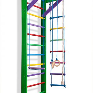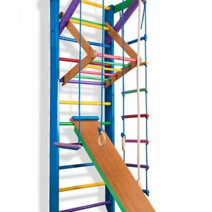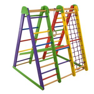 Комплектация Детский спортивный комплекс для квартиры Карамелька Plus 1 1. Шведская стенка. 2. Гладиаторская сетка. 3. Рукоход. 4. Детская горка Волна 5. Кольца.