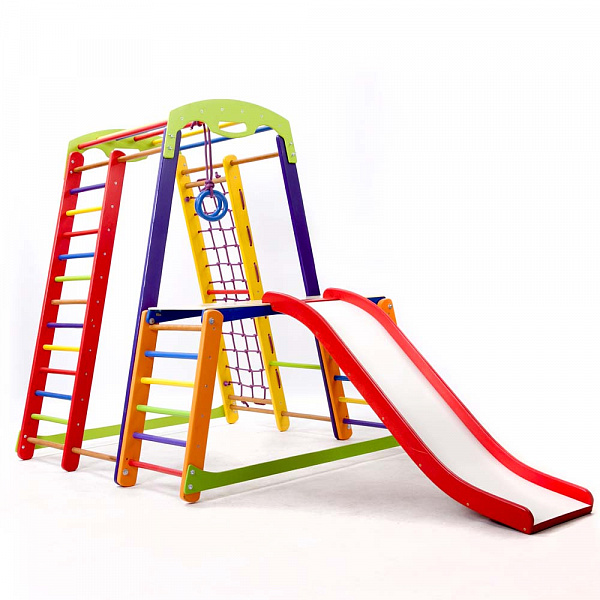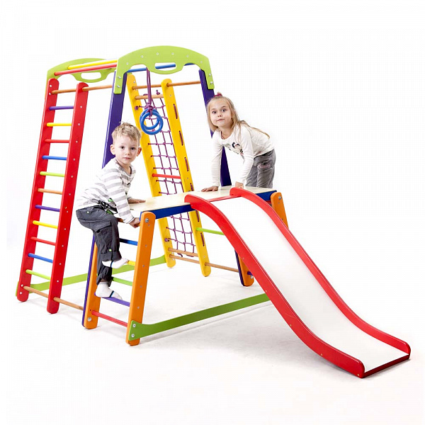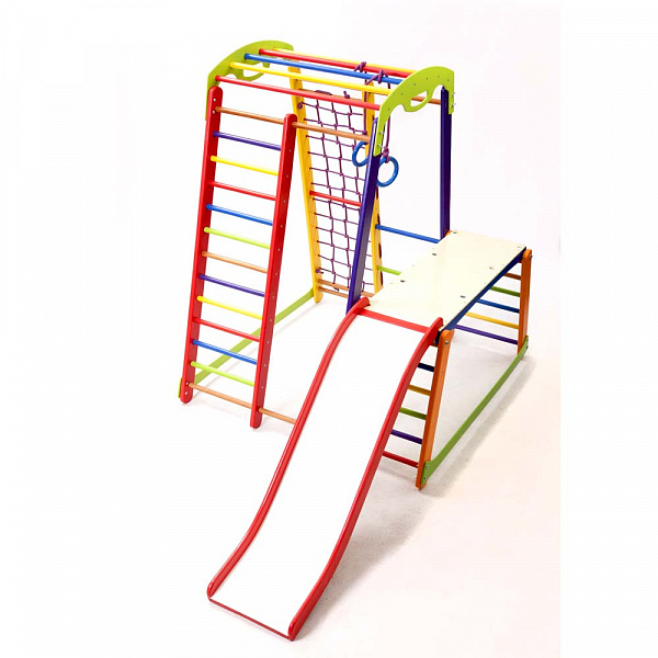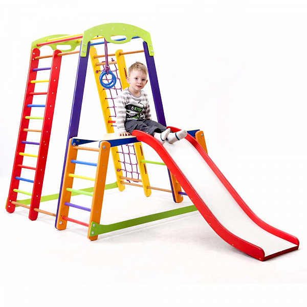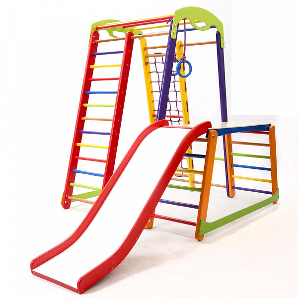 Комплектация Детский спортивный уголок- Кроха – 1 Plus 1-1 1. Шведская стенка. 2. Гладиаторская сетка. 3. Рукоход 4. Детская горка Волна 5. Кольца. 6. Стол-пристройка к детскому спорт уголку