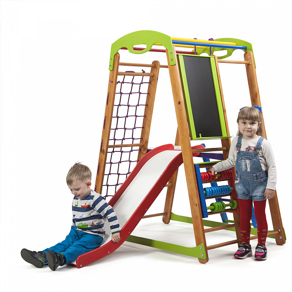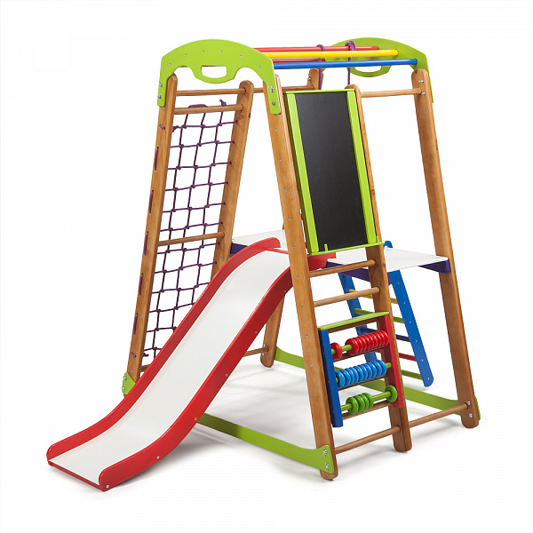 Комплектация Детский спортивный уголок – «Кроха – 2 Plus 3» 1. Шведская стенка. 2. Гладиаторская сетка. 3. Рукоход 4. Детская горка. 5. Кольца. 6. Лесенка 7. Столик 8. Мольберт (для мел/маркер) 9. Счеты цветные