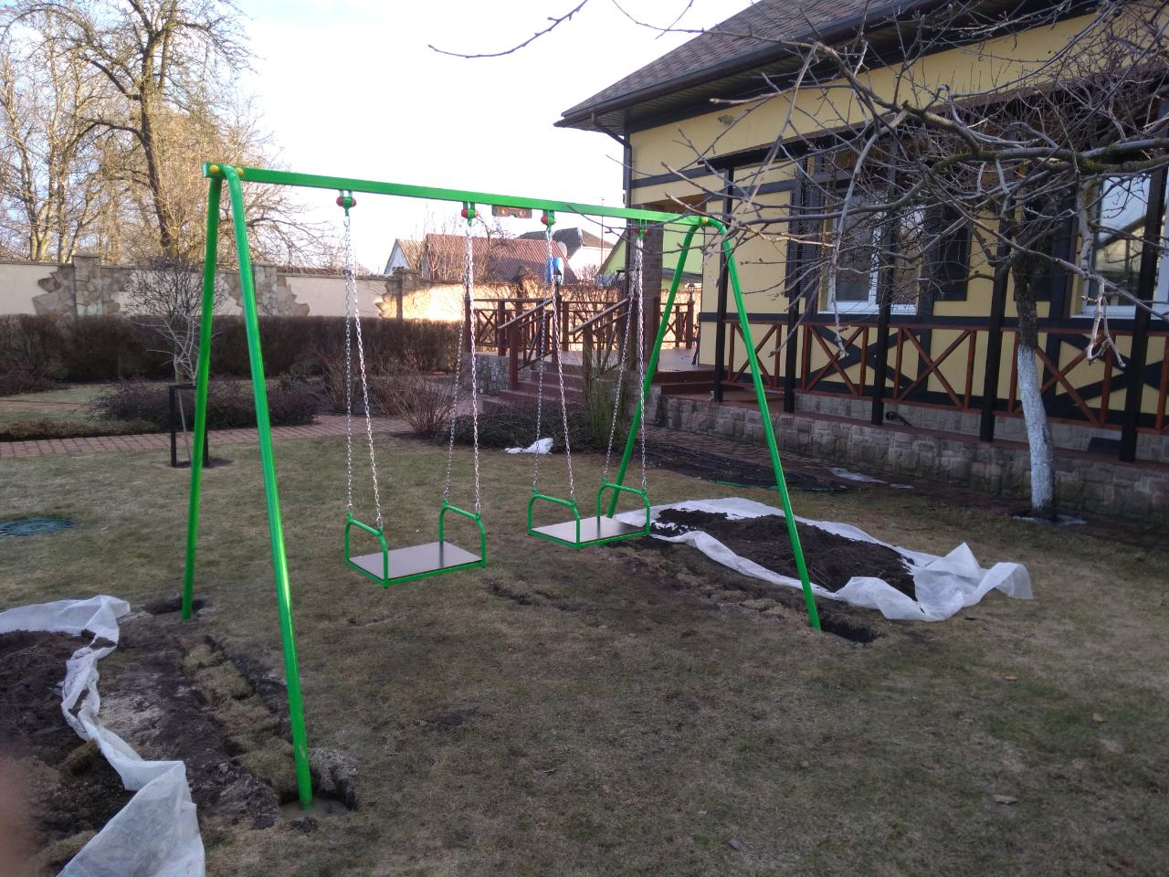 Две одноместные качели на одной перекладине, на подшипниках.