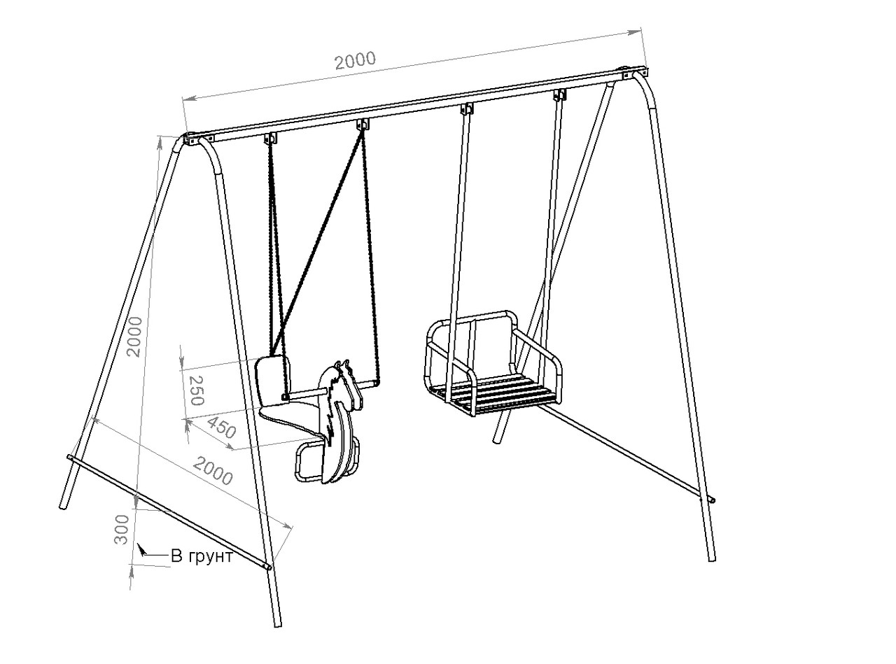 Крепление: бетонируется в грунт. Параметры: высота 200 см, ширина 200 см. -размер сидения 40*30 см, высота сидения от земли 45 см. – размер сидения “лошадка” 45*30, высота спинки 25см.