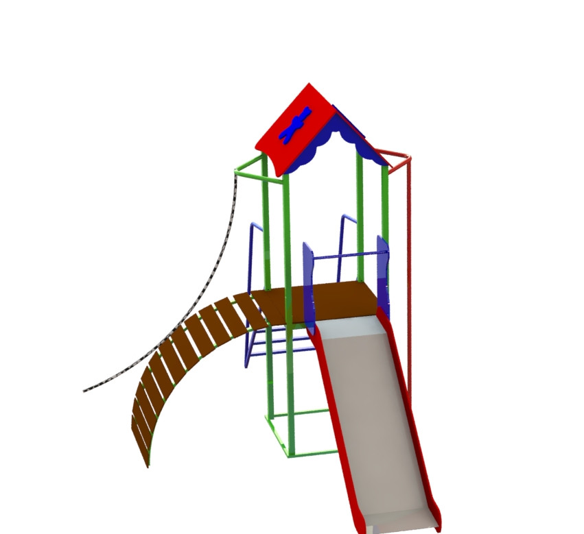 Материалы: металлические стойки и металлические перекладины, металлическая горка из зеркальной нержавейки, площадка перед горкой и перекладины мостика – водостойкая фанера.