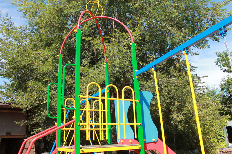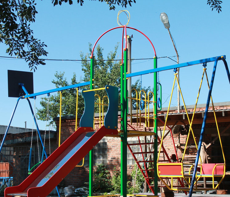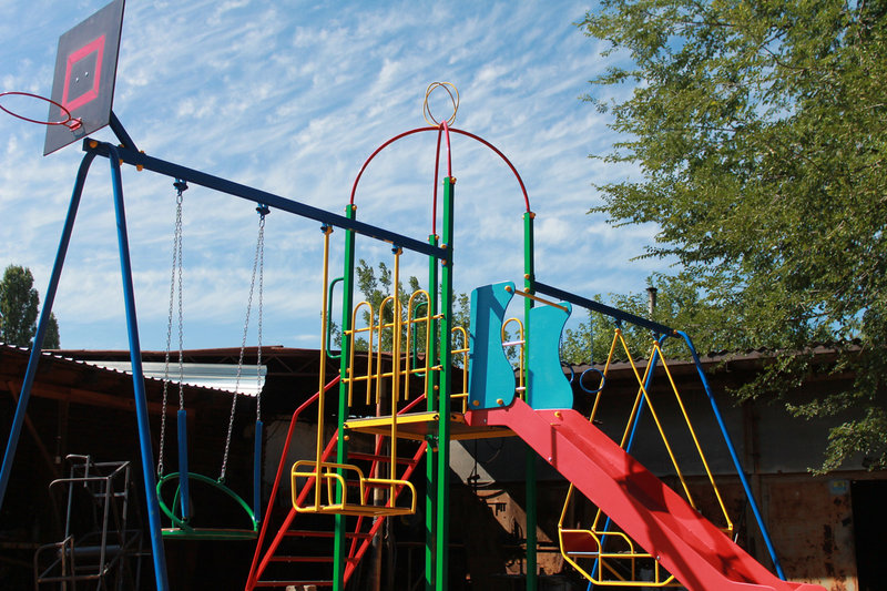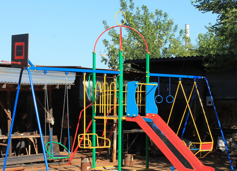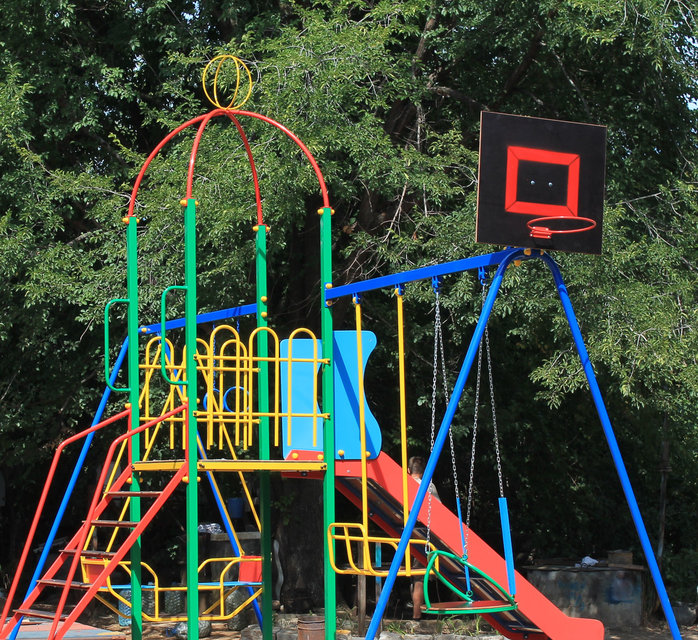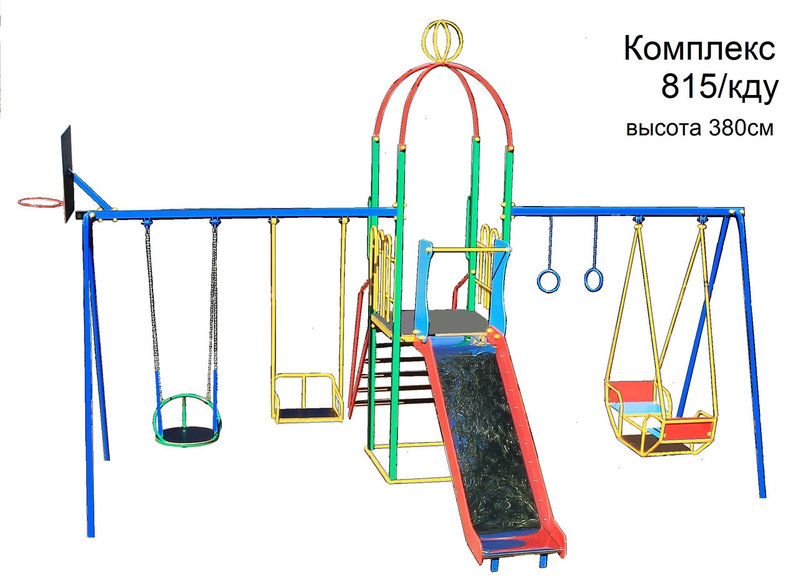 Материалы: металлические стойки и металлические перекладины, горка из нержавеющей стали на металлическом каркасе,с бортами из влагостойкой окрашенной фанеры, качели металлические, сидение качелей ― водостойкая ламинированная фанера. Одно сидение и лодочка – на жесткой сцепке, еще одно сидение – на цепях. Гимнастические кольца металлические на цепях. Баскетбольный щит- ламинированная влагостойкая фанера, баскетбольное кольцо- металлическое без сетки.