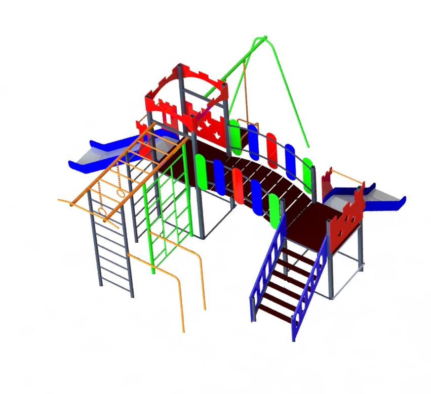 Комплекс разборной, состоит из двух башен с горками, которые соединяются мостиком и качели.