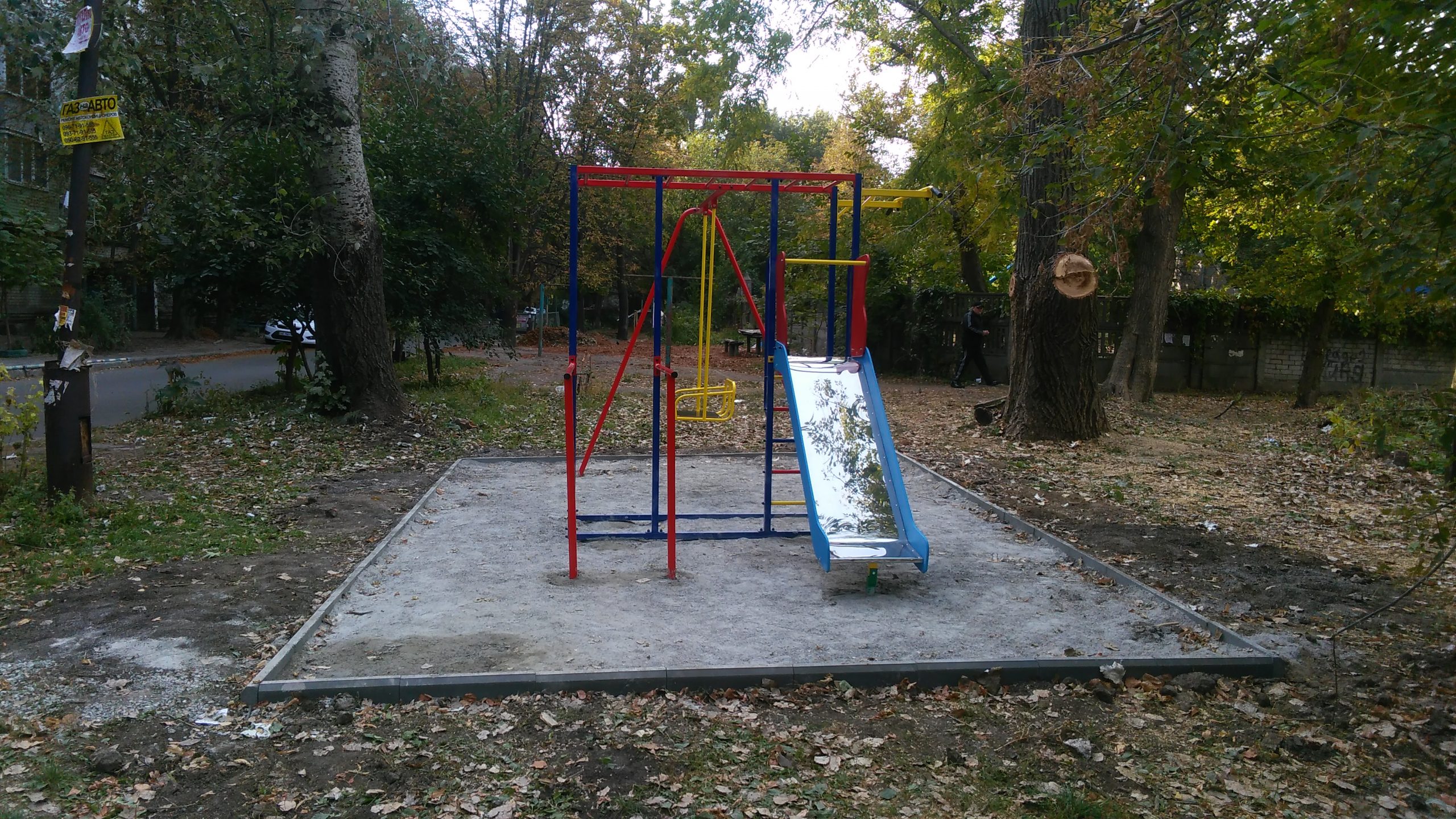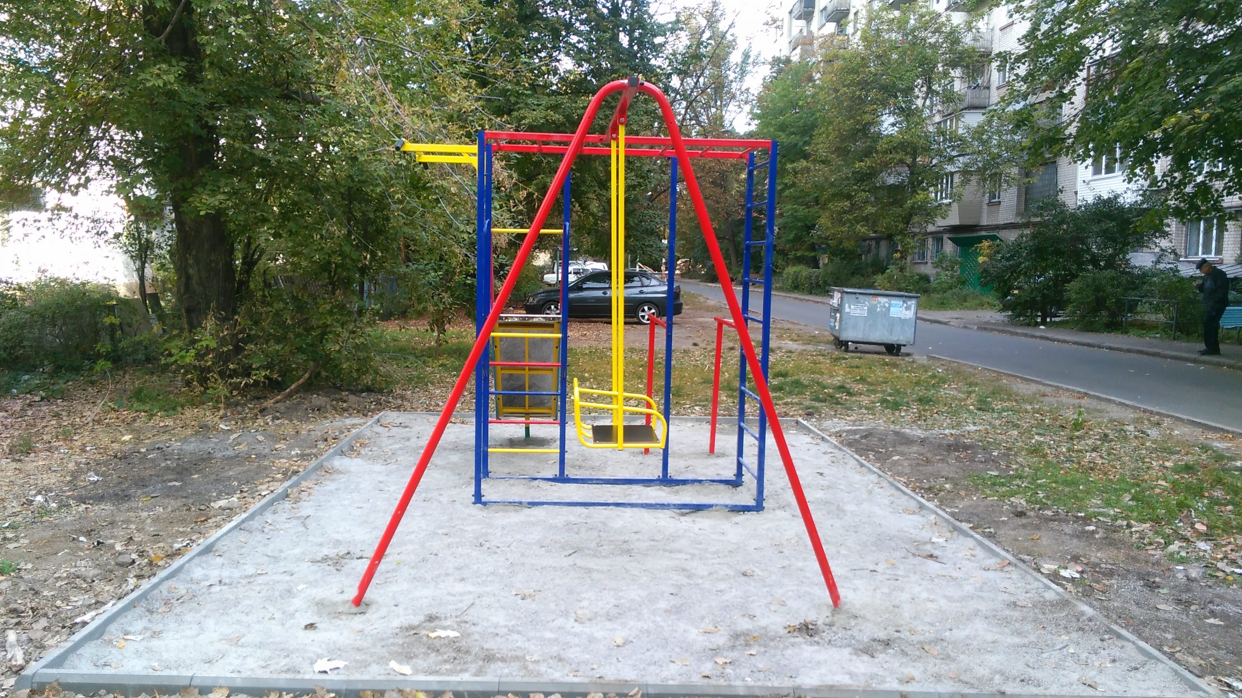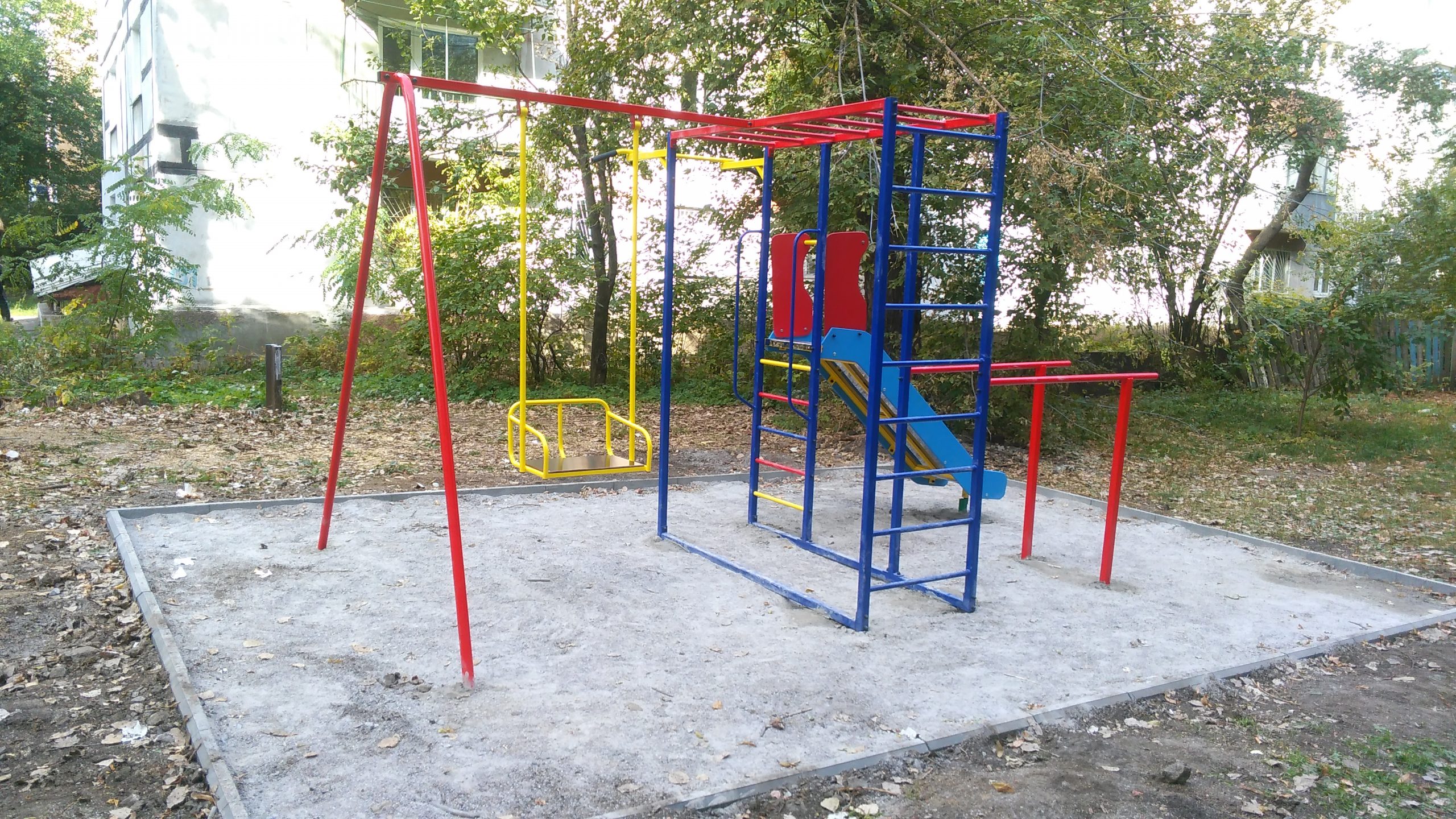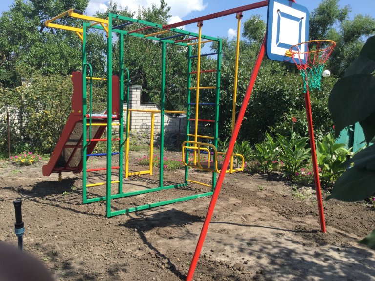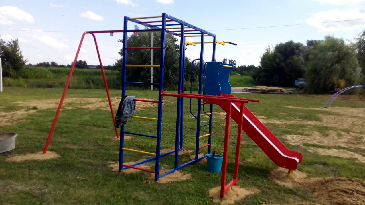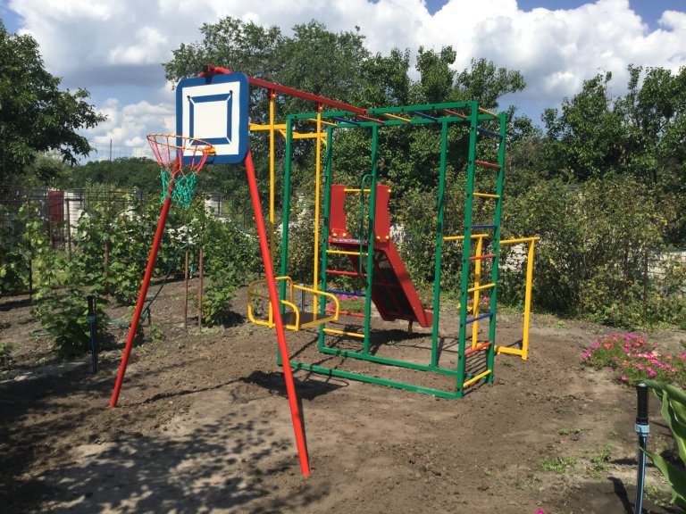 Бортами из влагостойкой окрашенной фанеры, турник с прорезиненными ручками, качели металлические,