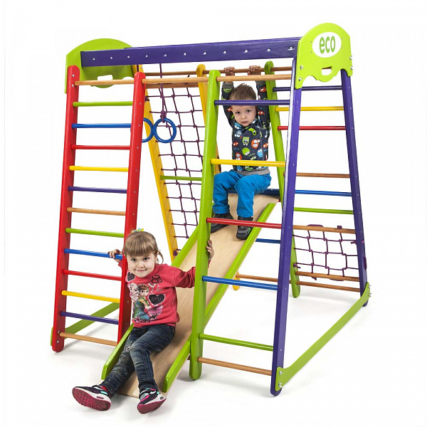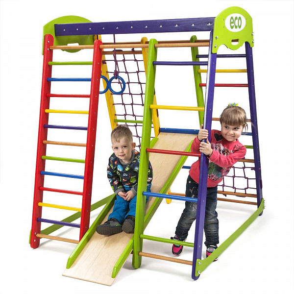 Комплектация Спортивный комплекс для дома «Акварелька мини» 1. Шведская стенка. 2. Гладиаторская сетка. 3. Рукоход. 4. Детская горка. 5. Кольца.