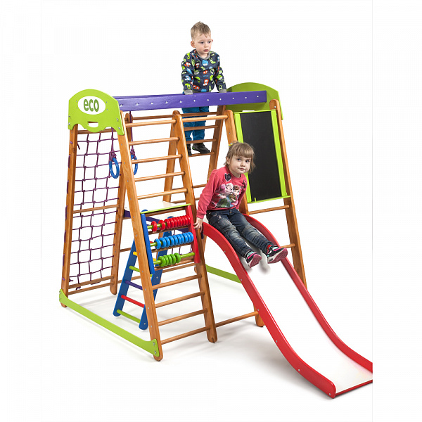 Комплектация Спортивный комплекс для дома «Карапуз Plus 3» 1. Шведская стенка. 2. Гладиаторская сетка. 3. Рукоход. 4. Детская горка. 5. Кольца. 6. Счеты «цветные». 7. Мольберт. 8. Столик 9. Лесенка