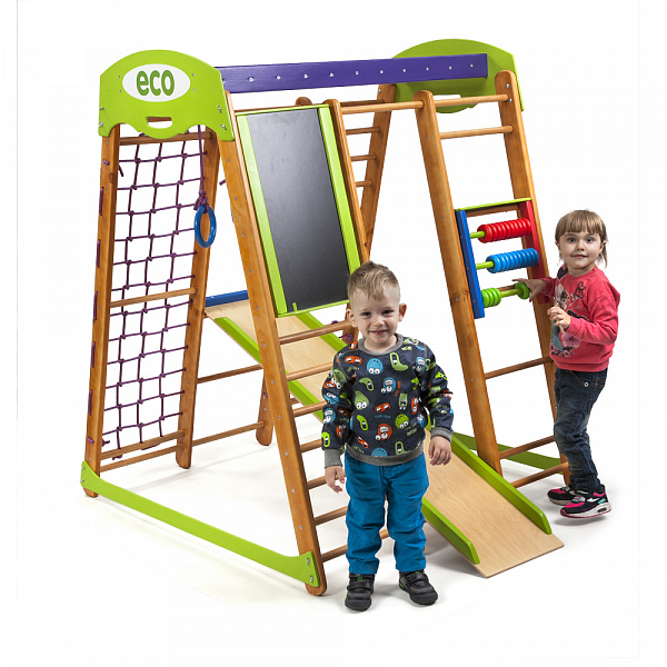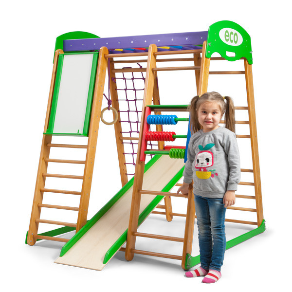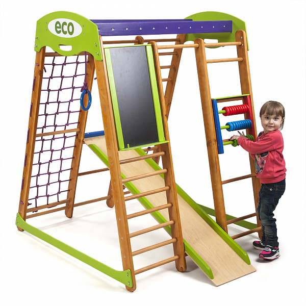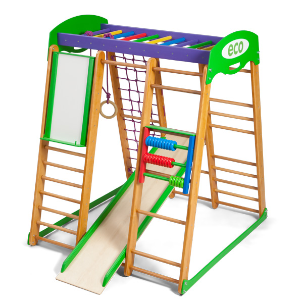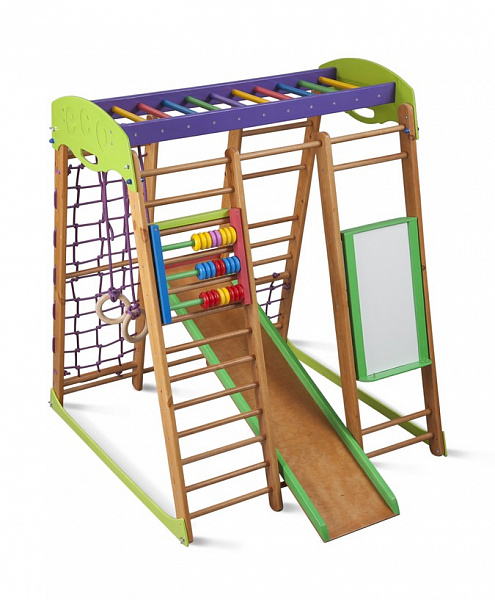 Вес конструкции всего 30 килограммов, но она выдержит довольно крупных детей. Благодаря классическому цвету комплекс хорошо впишется в самый строгий интерьер, если нет возможности разместить его в детской комнате. Габариты уголка «Карапуз» 100×120 сантиметров. Комплектация Спортивный комплекс для дома «Карапуз» 1. Шведская стенка. 2. Гладиаторская сетка. 3. Рукоход. 4. Детская горка. 5. Кольца. 6. Счеты «цветные». 7. Мольберт. (для мел/маркер)