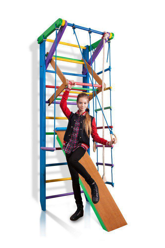 Комплектация Спортивный уголок «Радуга 3-240» 1. Шведская стенка с турником. 2. Канат. 3. Кольца. 4. Трапеция. 5. Веревочная лестница. 6. Детский сьемный турник-рукоход. 7. Доска для преса. А так же крепежный комплект. Для безопасности рекомендуем купить мат гимнастический. Детский спортивный уголок поставляется в разобранном виде.