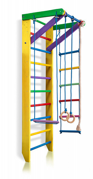 Комплектация Спортивный уголок «Юнга 2-220»: 1. Шведская стенка с турником. 2. Канат. 3. Кольца. 4. Трапеция. 5. Веревочная лестница. А так же крепежный комплект. Для безопасности рекомендуем купить мат гимнастический. Детский спортивный уголок поставляется в разобранном виде.