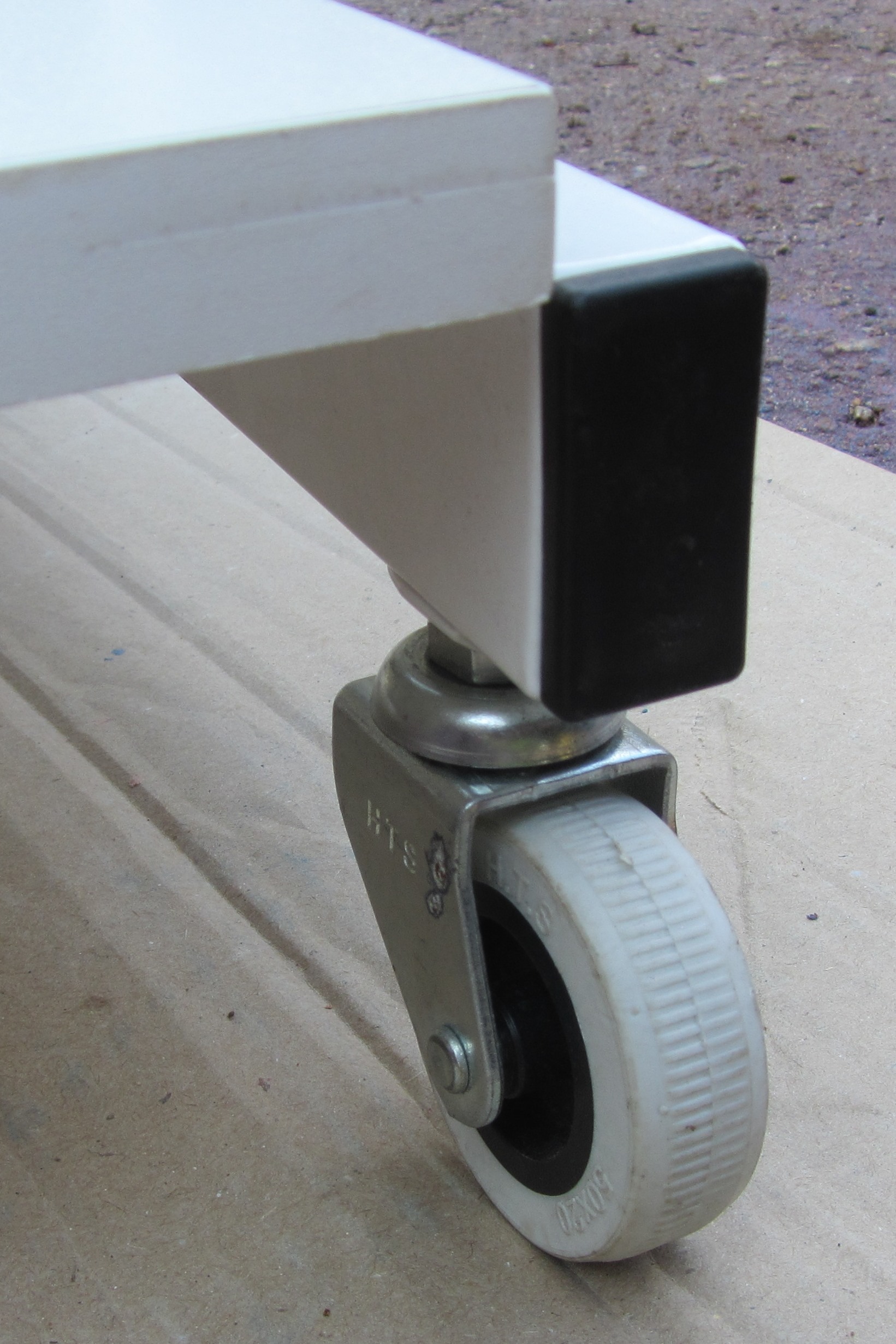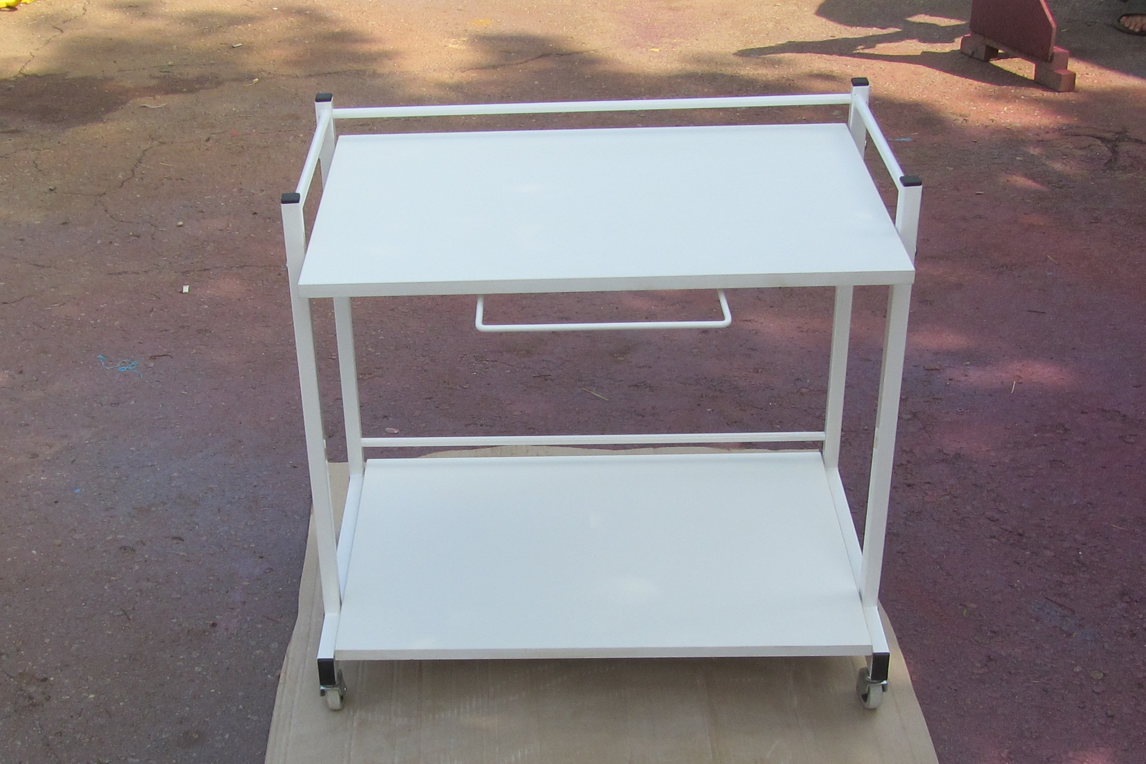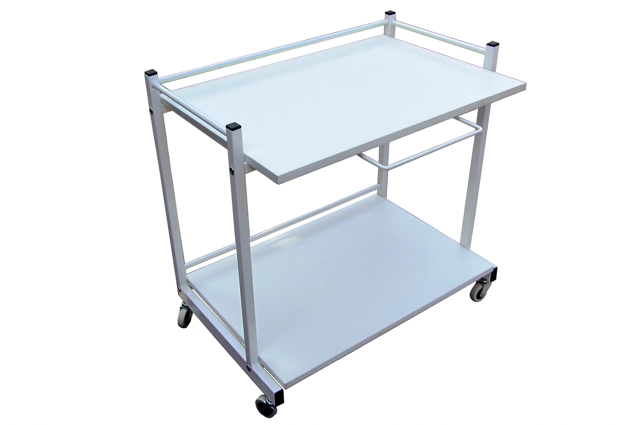 Столик представляет собой тележку на усиленной колесной опоре. На металлическом каркасе закреплены металлические рамки с деревянными полками из ламинированного ДСП. Модель имеет два уровня для размещения необходимых для работы мастера аппаратов и принадлежностей. Например, на нижнем ярусе можно хранить препараты, а на верхнем — те предметы и инструменты, которыми специалист пользуется чаще всего, поскольку они будут находиться в максимальной доступности.