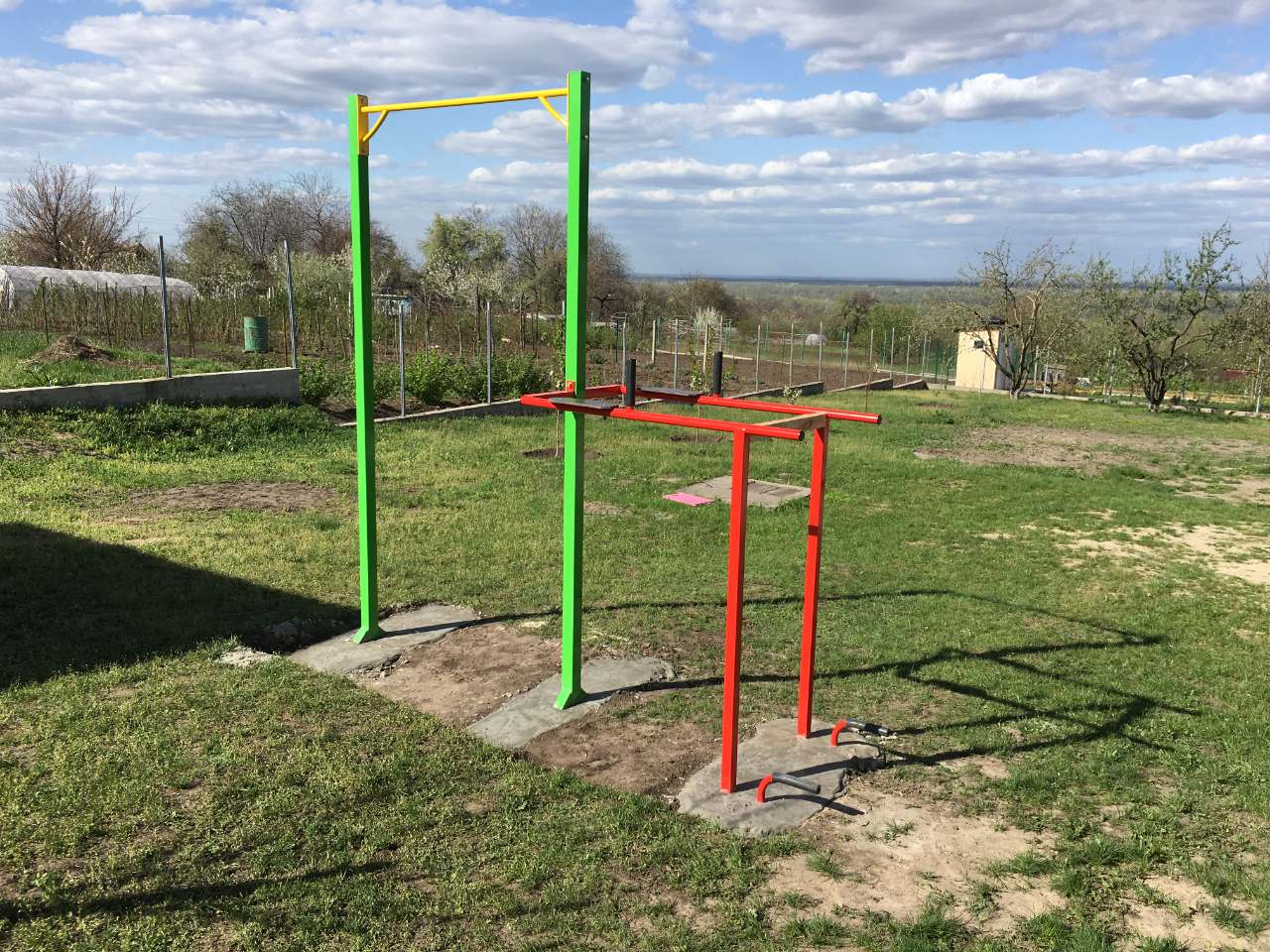 Параметры: высота 250 см, (плюс 40 см бетонируется), ширина турника 120 см, высота брусьев 130 см, ширина брусьев 55 см, ручки для жима лежа на высоте 10 см от земли.
